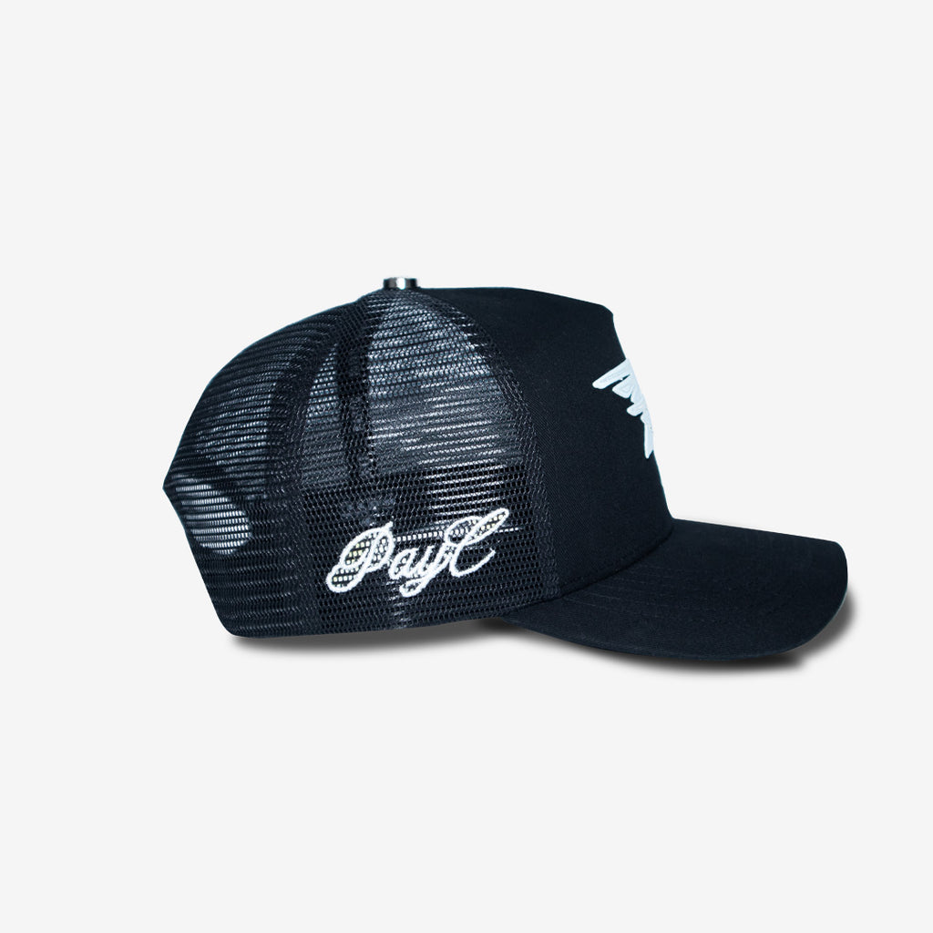 Trucker cap with leather-embroidered logo on the front. Mesh back panel. Adjustable strap.